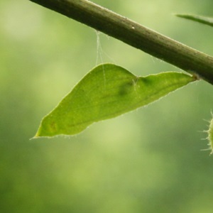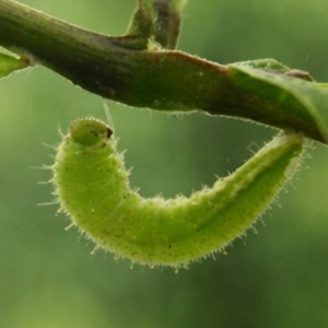 幼虫は特に細長く、食草の実とその形や色が紛らわしい。体色は緑色、長短不ぞろいの黒色毛を生じる。 | 形態はキチョウによく似ていますが、胴部の色彩は黄色身の強い緑色です。 | ホシボシ幼虫を上から見たとき に背線(消化管)がくっきりとしています。 |