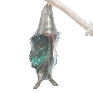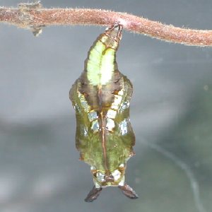 イチモンジチョウの蛹です。 羽化が近づいているらしく、銀白斑も消えうっすらと 翅が透けて見えています。 光によっては翅の部分が青緑色に光って見えています。 |