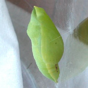 概形は側面から見るとくの字型で、腹面は体の中央部で膨出しこの部分で接着物に接しています。前後端に向かって体は細くなり、特に頭部はとげ状に鋭い。 | 側面から見た場合に頭部突起が体前半の腹縁線とほぼ平行に突出しています。やや半透明の感がありますが、羽化が近づくと次第に不透明になります。 | 概形はキチョウに似るが遥かに大型で、背・腹面から見ればより幅広く、前翅基部の突起は強く、この部分で強く角ばる。頭部の角状突起は長い。色彩は緑色。 | 概形はモンシロチョウに比べてやや細長い感じで、背、腹面より見た場合は特にその感が強い。頭部中央突起はより鋭く長い。スジグロシロチョウとは構造上の差異点は見出せない。 | 既形ははとむね型に属するが、側面から見た腹部中央の腹面への腹面への張り出しは日本産のはとむね型の蛹ではもっとも弱い。体長に対する横幅は広い。 | |||