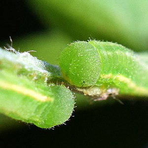 幼虫は特に細長く、食草の実とその形や色が紛らわしい。体色は緑色、長短不ぞろいの黒色毛を生じる。 | 形態はキチョウによく似ていますが、胴部の色彩は黄色身の強い緑色です。 | ホシボシ幼虫を上から見たとき に背線(消化管)がくっきりとしています。 |