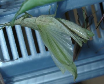 | 朝起きるとオンブバッタが脱皮していました。 成虫のしっかりした羽が開いています。 |