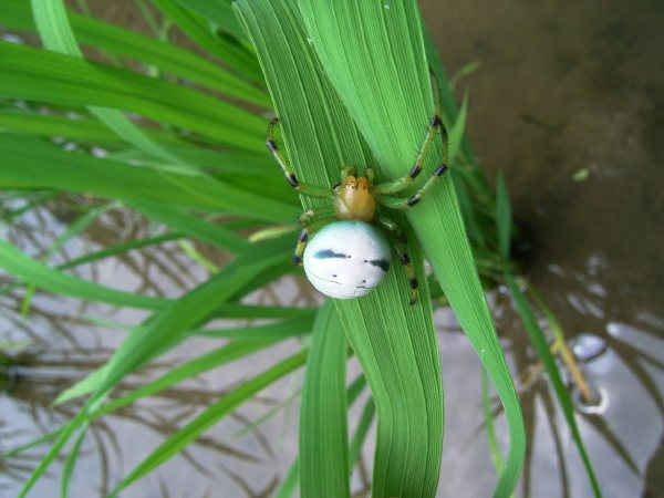 奈良県生駒市高山町の田んぼで 光田さんが撮影されたアオオニグモです。 |
