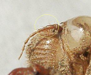 ミンミンゼミの脱け殻です。 アンテナは細く毛が少ない です。 第3節と第2節は同じくらいの 長さで細くなっています。 |