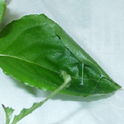 | 飼育ケースに台座を作り休んでいると ころです。 腹側から撮影したものです。 体長は2.4センチでした。 尾脚がありません。 また尾端部に尾状突起があります。 |