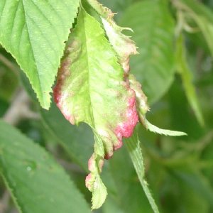 2002.5.21撮影 桜の葉 サクラハトサカフシ サクラフシアブラムシの寄生によって、ソメイヨシノ、サト ザクラなどの葉の表面の側脈に沿って袋状の虫えいが 形成されます。 長さ25〜35ミリ、直径約10ミリ。 表面の色は淡紅〜紅色。 |
