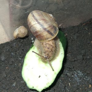 | カタツムリの食事です。きゅうりの柔らかいところからく り抜くようにして食べていました。 |